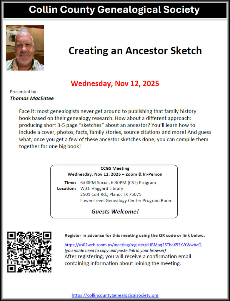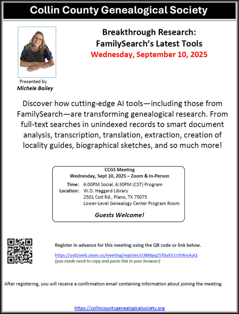 The emergence of Artificial Intelligence has transformed genealogical research methods.Dr. Bernard N. Meisner will share which Artificial Intelligence innovations are worth pursuing at 7:30 p.m. Thursday, September 18, Allen Heritage